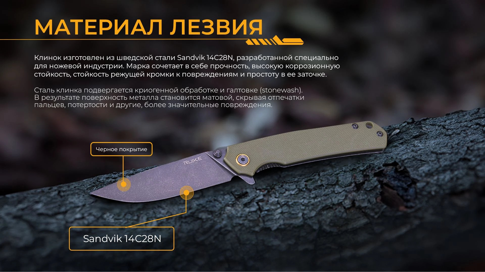 - клинок из стали Sandvik 14C28N с черным покрытием;