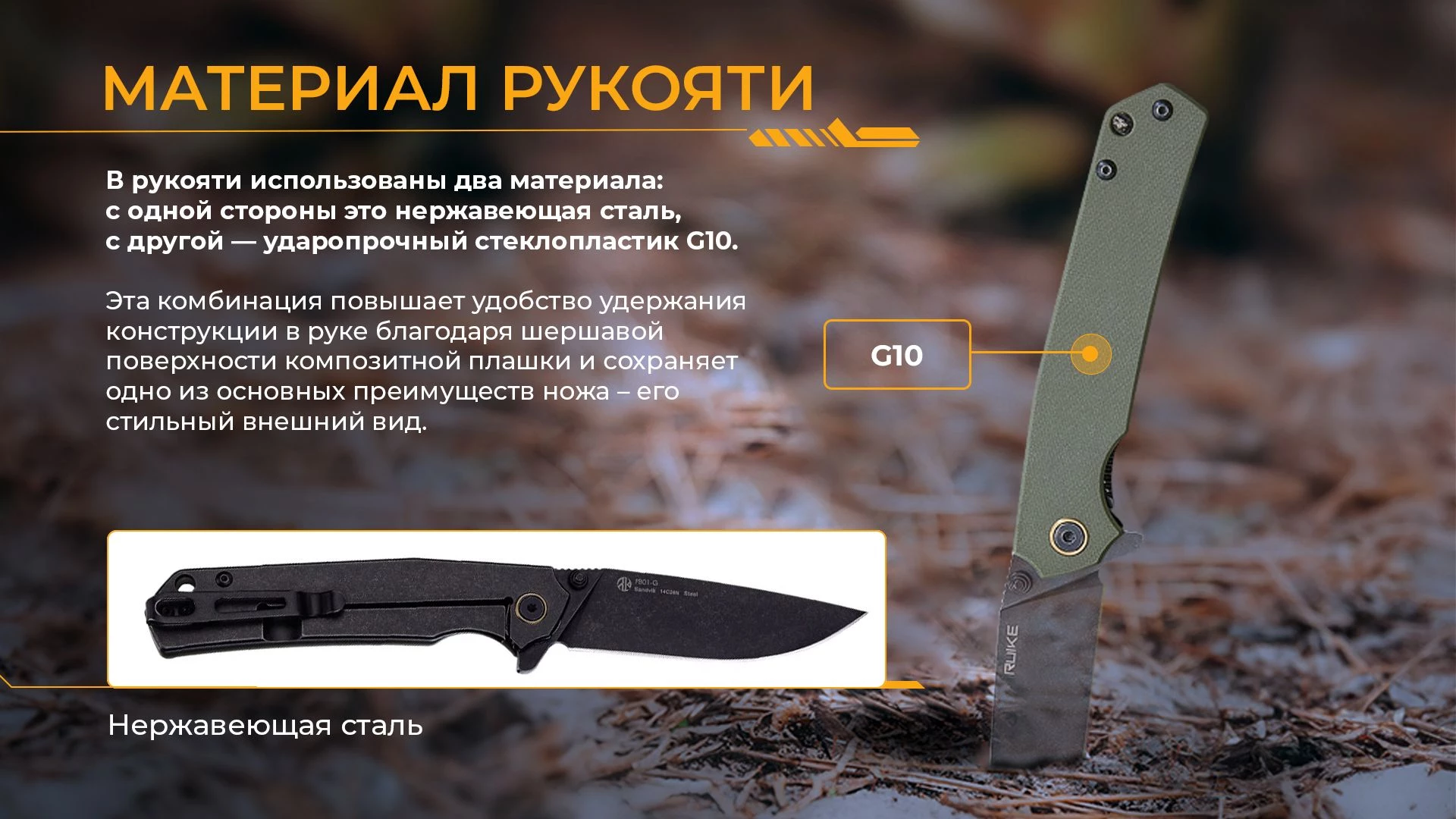 - материал рукоятки - нержавеющая сталь + стеклопластик G10 зеленого цвета;